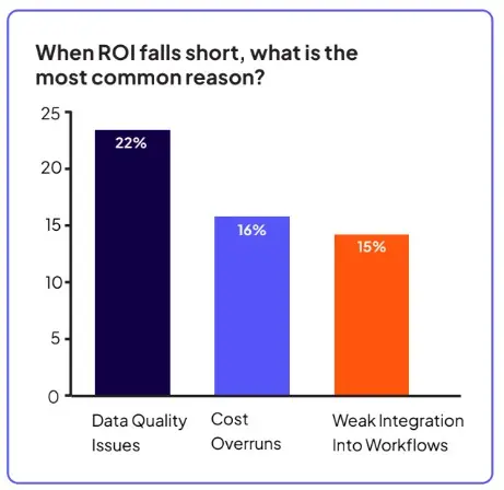 AI wordt inmid­dels in de gehele organi­satie geïnte­greerd, maar het behalen van een consis­tent rende­ment op de inves­te­ring blijft lastig. Als antwoord op de vraag waarom AI-initi­a­tieven tekort­schieten, noemden de respon­denten verschil­lende uitda­gingen: datakwa­li­teit (22%), kosten­over­schrij­dingen (16%) en slechte integratie in bestaande workflows (15%). Deze obsta­kels benadrukken de aanhou­dende complexi­teit van het vertalen van AI-inves­te­ringen naar meetbare bedrijfsresultaten.