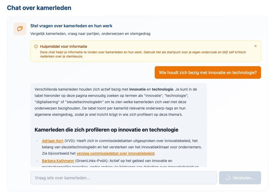 De tool richt zich primair op zittende Kamer­leden omdat daarover de meeste concrete parle­men­taire data beschik­baar is. Voor nieuwe kandi­daten kan de AI-assis­tent infor­matie zoeken uit andere bronnen zoals gemeen­te­raden, Provin­ciale Staten of verkiezingsprogramma’s.